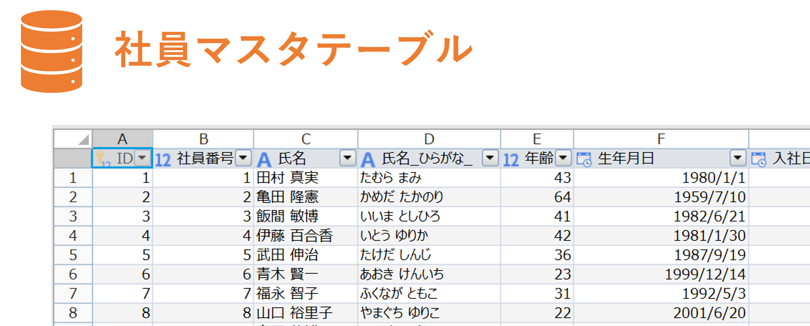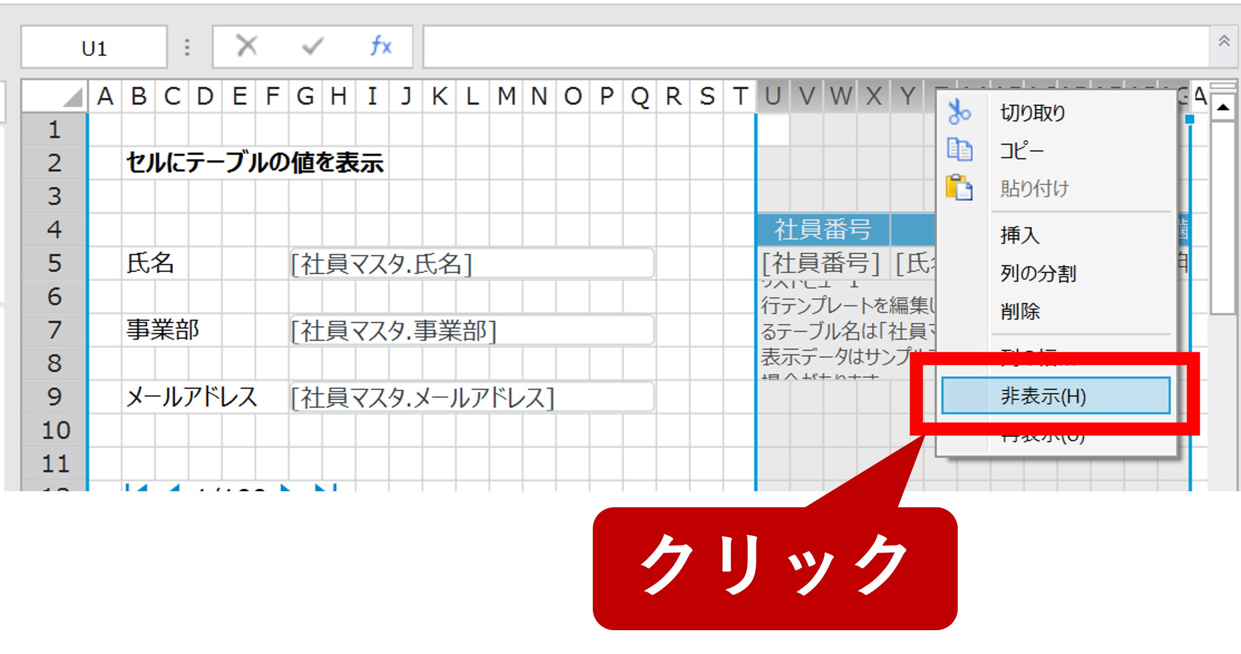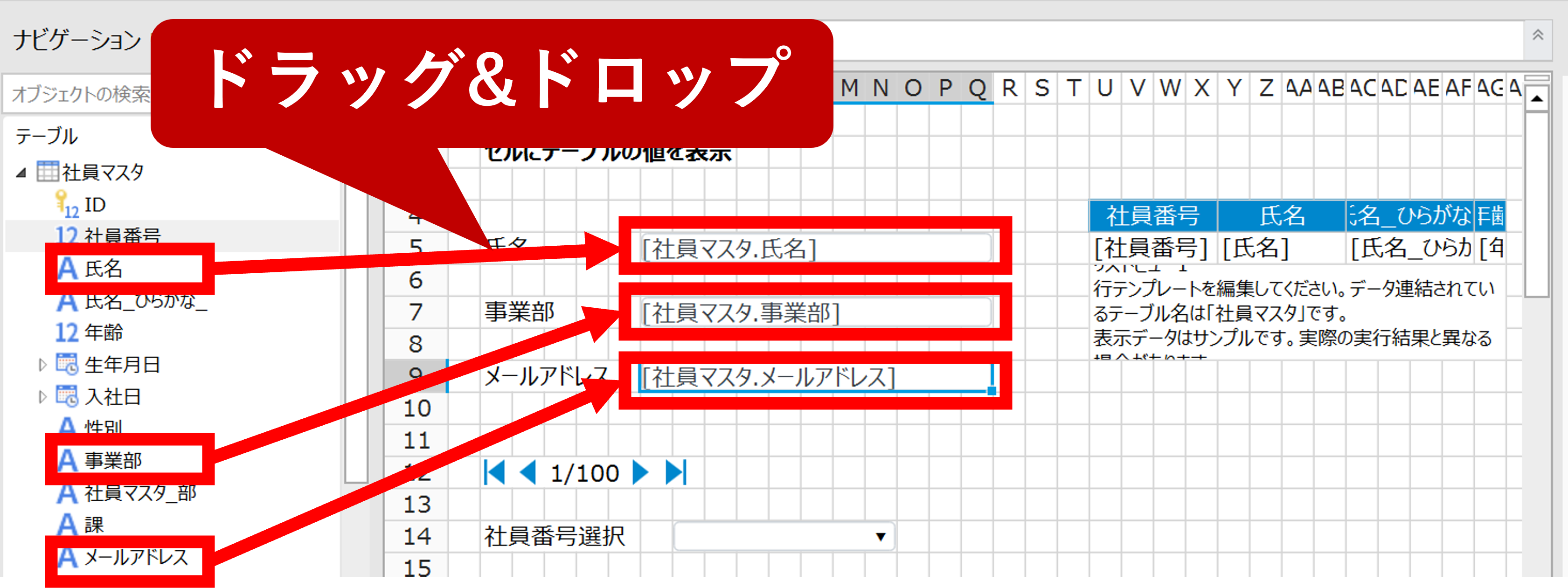 ナビゲーションウィンドウから下表の通りに社員マスタの項目をセルにドラッグ&ドロップします。
