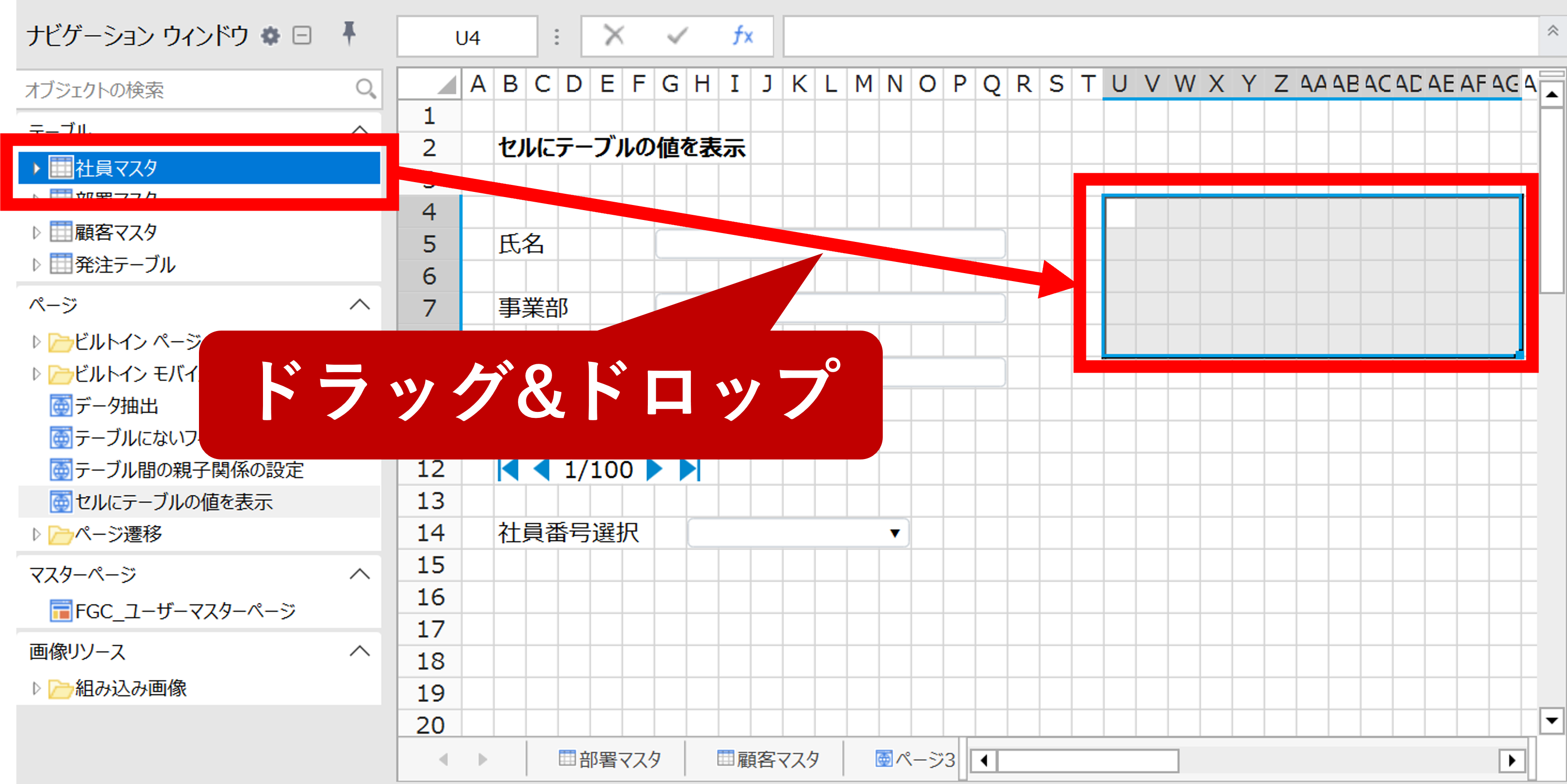 ナビゲーションウィンドウからU4セル~AG8セルを選択した状態で社員マスタをドラッグ&ドロップします。