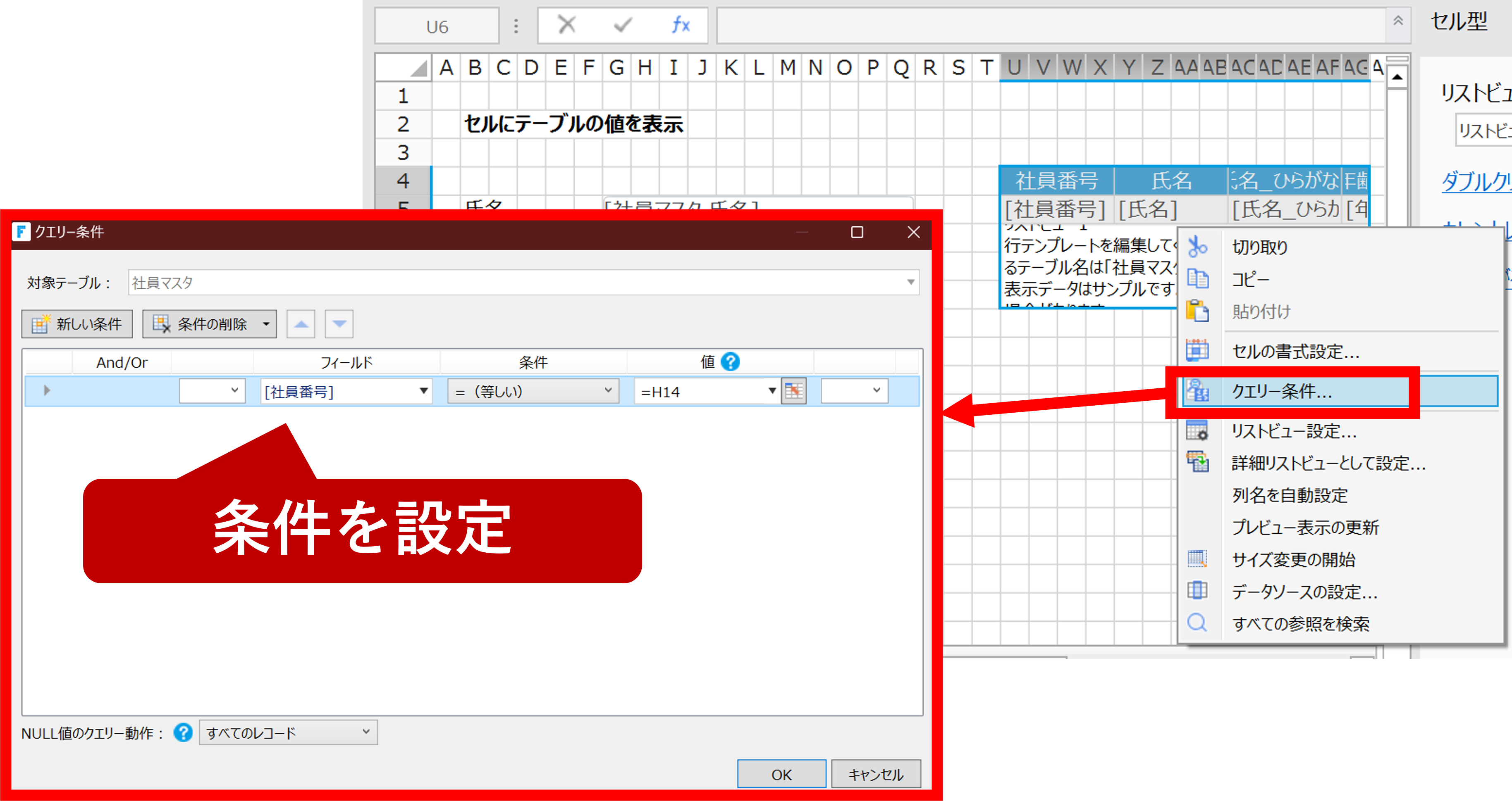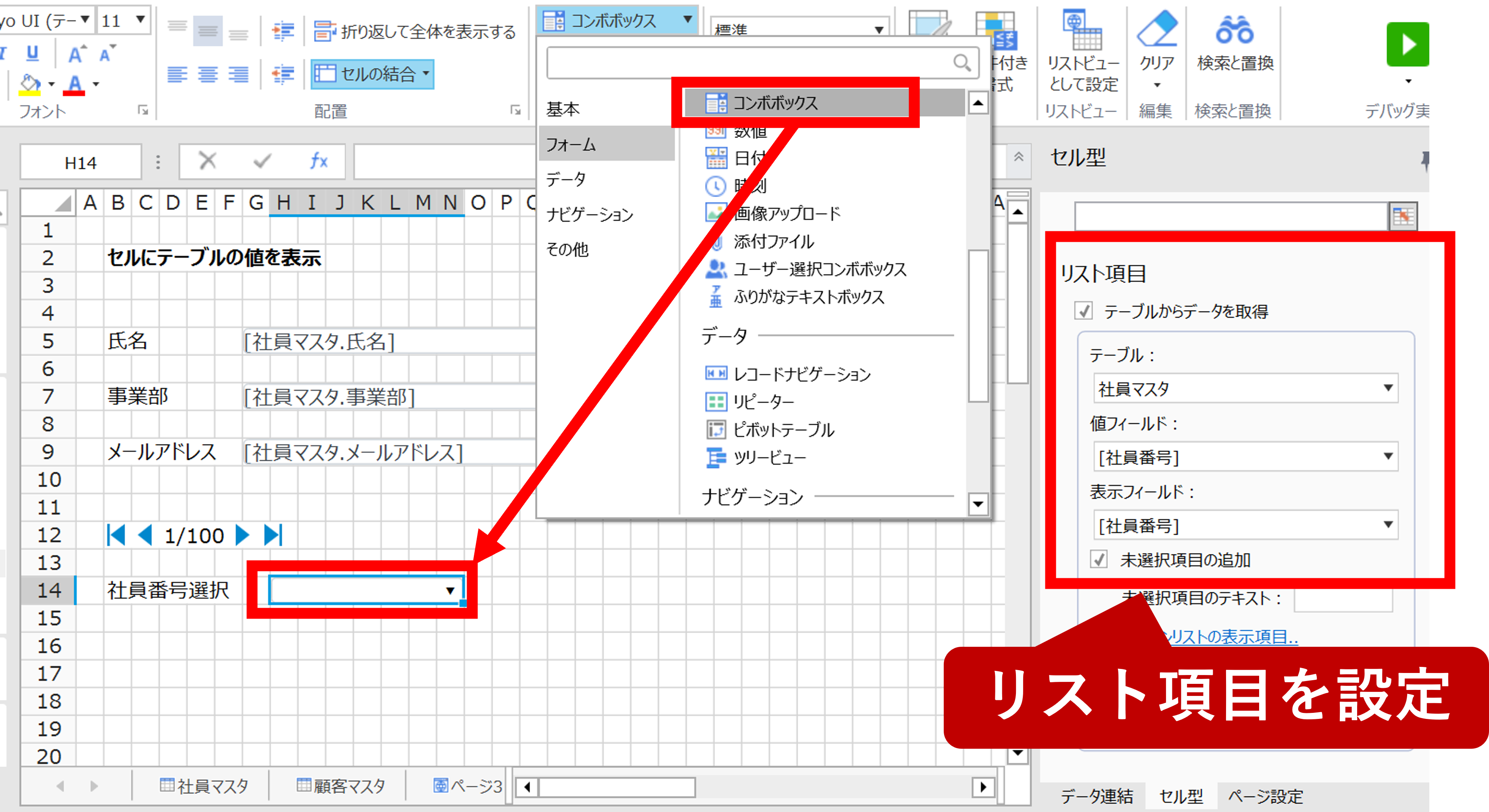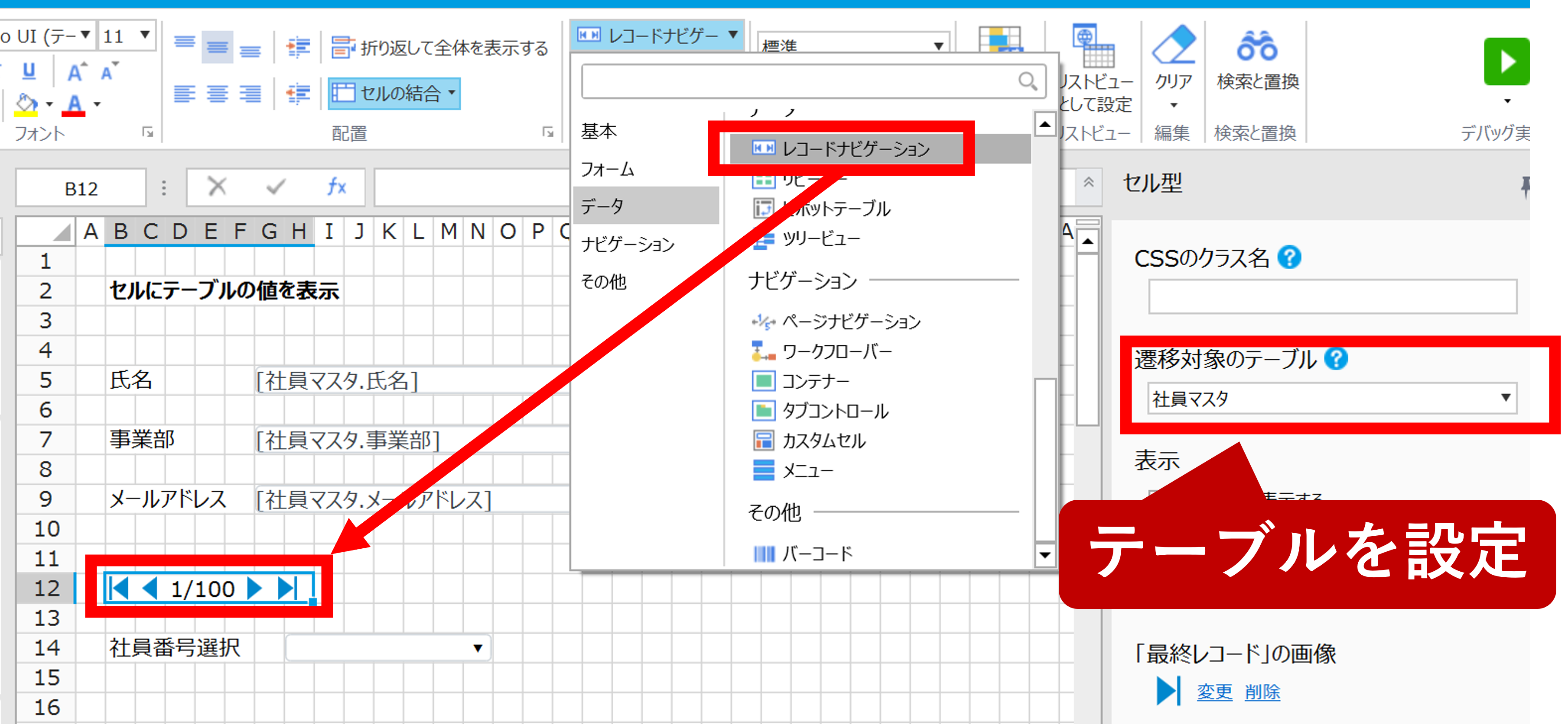右ペインの[セル型]タブにある[遷移対象のテーブル]で社員マスタを選択しておきます。