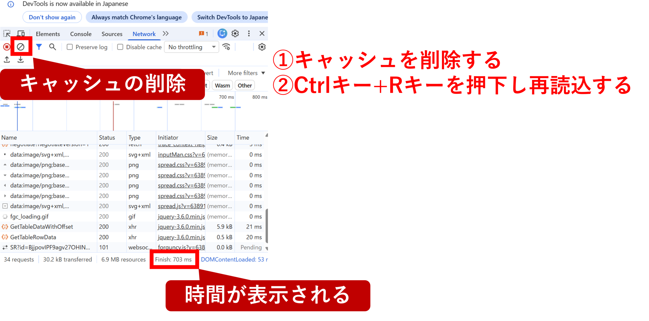 例としてGoogle Chromeブラウザをお使いの場合は、デバッグ実行時にGoogle Chromeを指定し、F12キーを押下してNetworkタブを開き、以下の画像のような手順を踏むことでページロードにかかるおおよその時間を知ることができます。