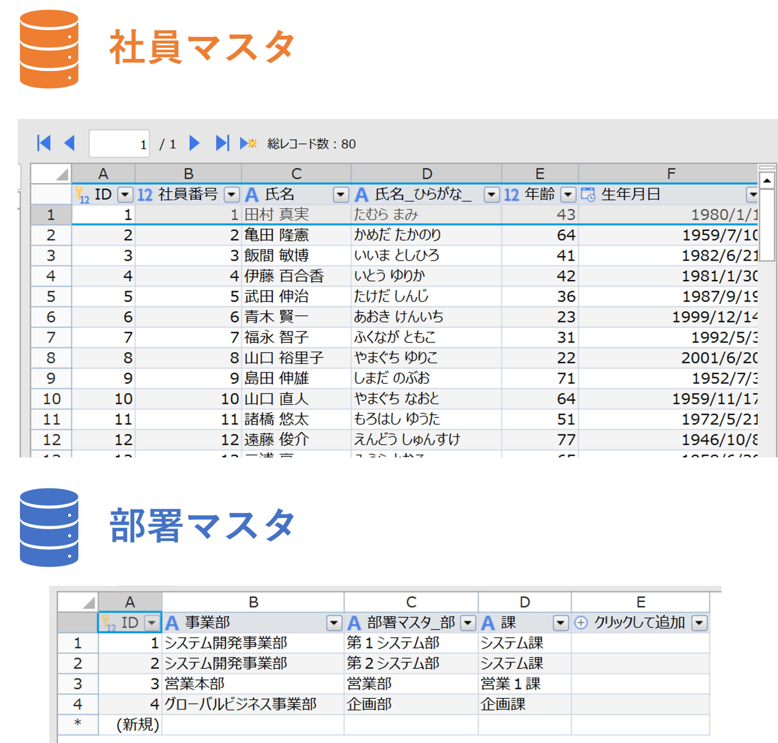 今回は社員マスタと部署マスタを使用します。