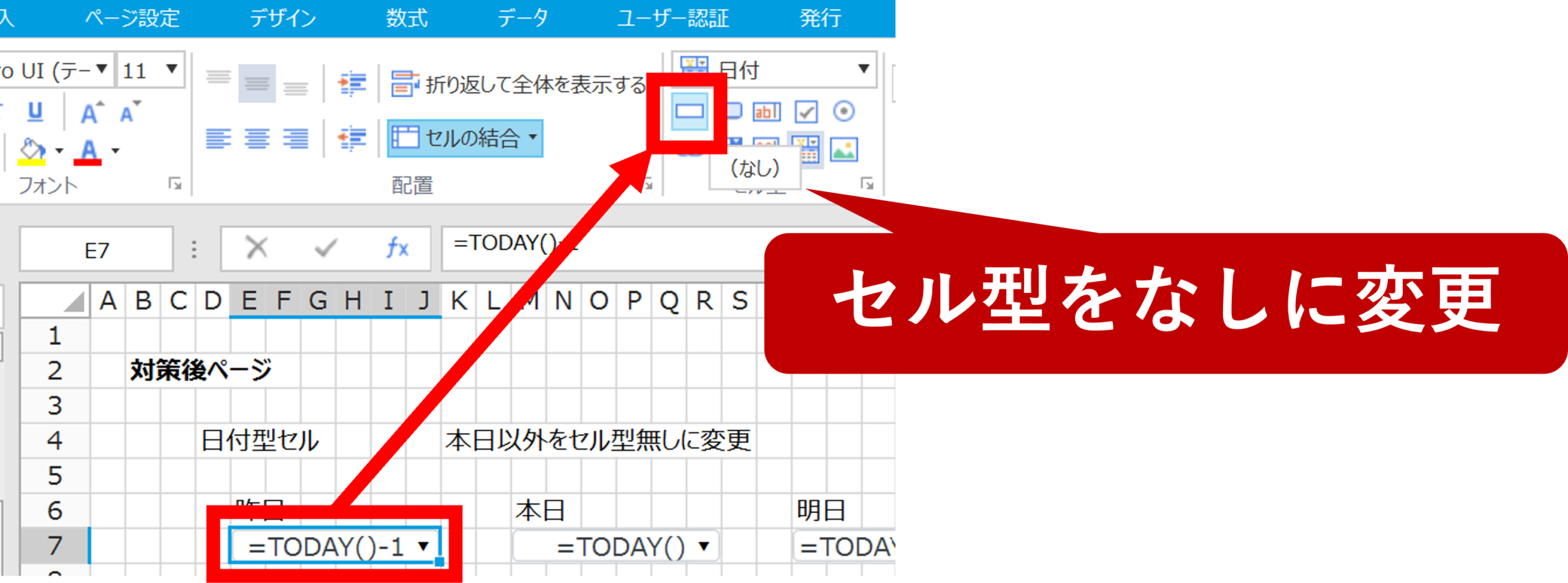 まずE7セルを選択し、リボンの[ホーム]>[セル型]のドロップダウンから(なし)を選択します。