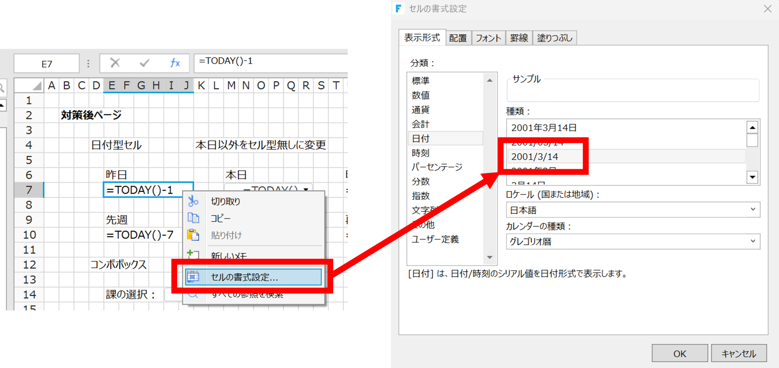 セルの書式設定ウィンドウが開くので、「分類」を「日付」、「種類」を「2001/3/14」に変更します。
