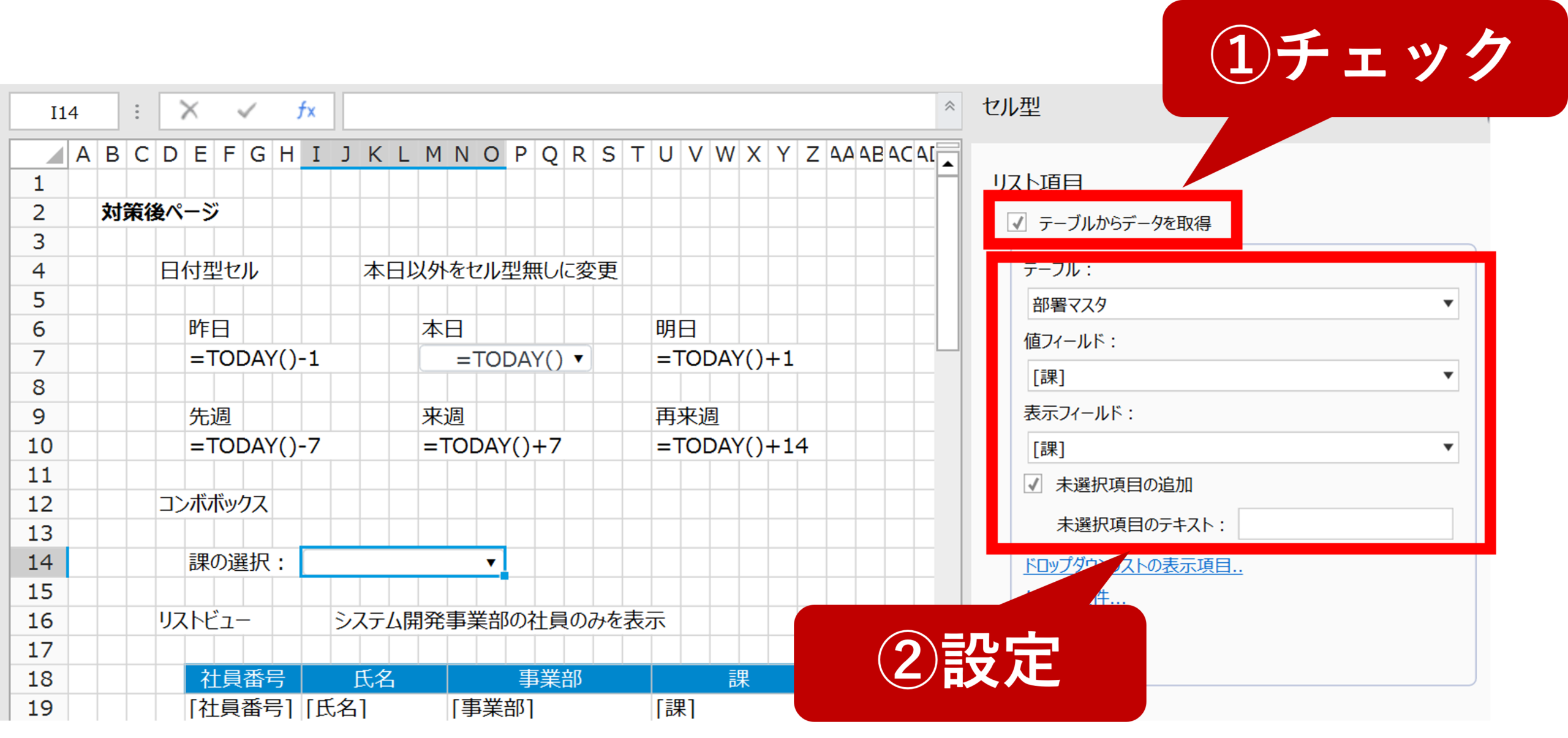 既にI14セルに設定済みのコンボボックスでユーザーが表示データを任意のタイミングで絞り込めるような設定がしてあります。