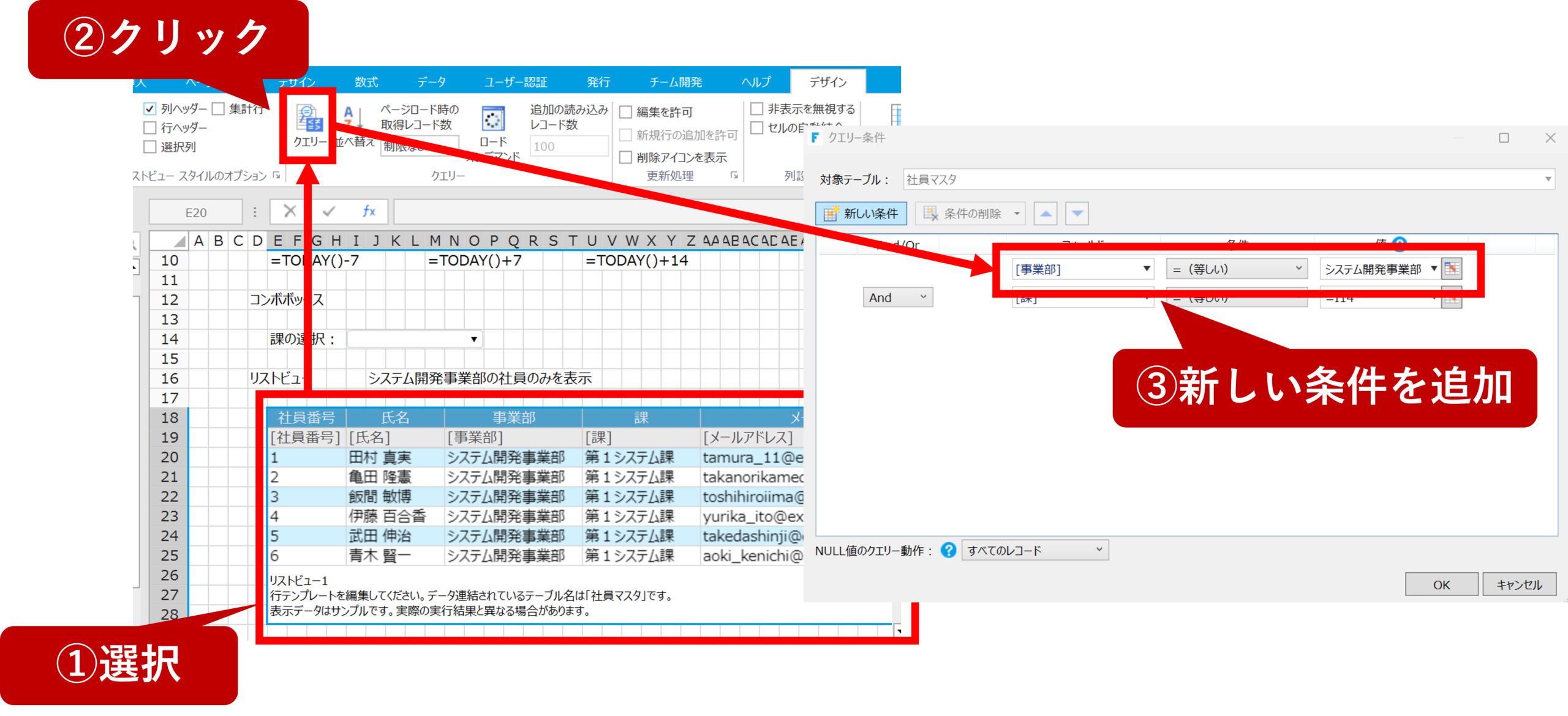 | [事業部] | =(等しい) | システム開発事業部 |