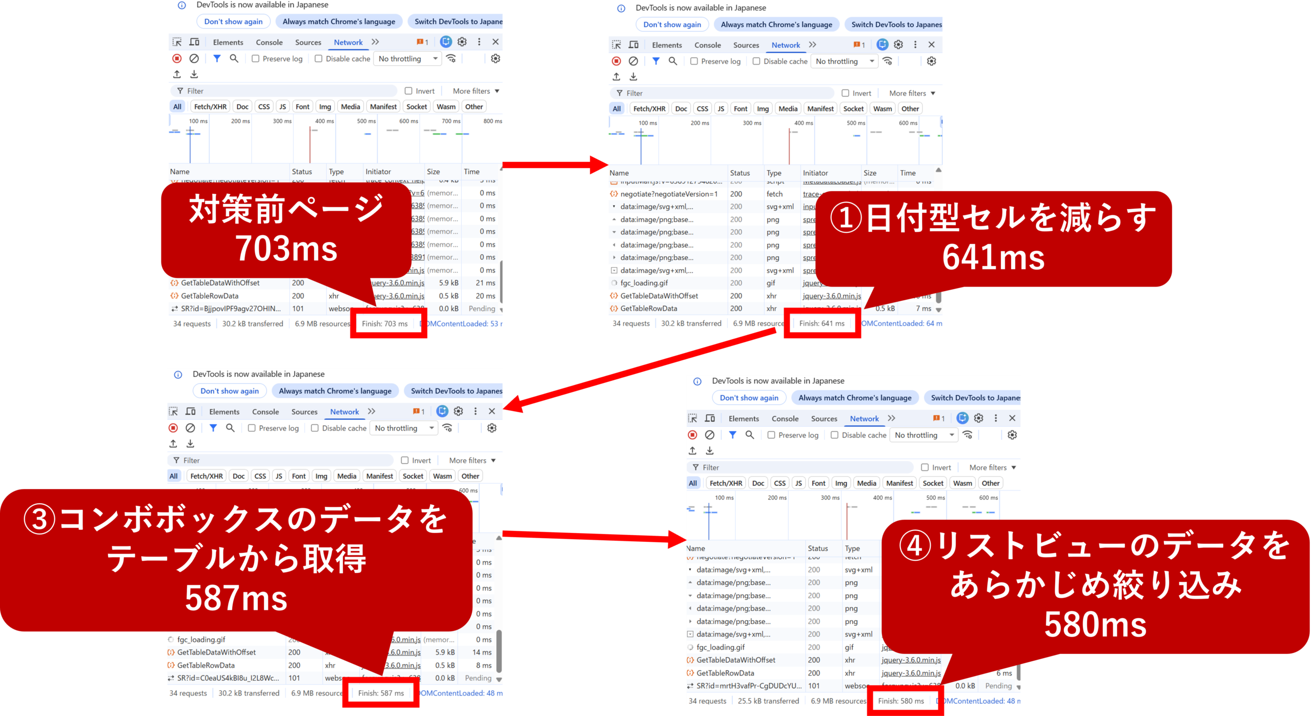 対策前ページ、対策後ページをそれぞれデバッグ実行し、ページが開くまでの時間を確認してください。
